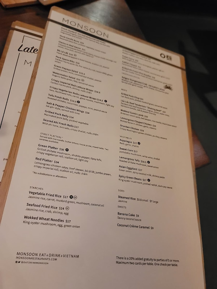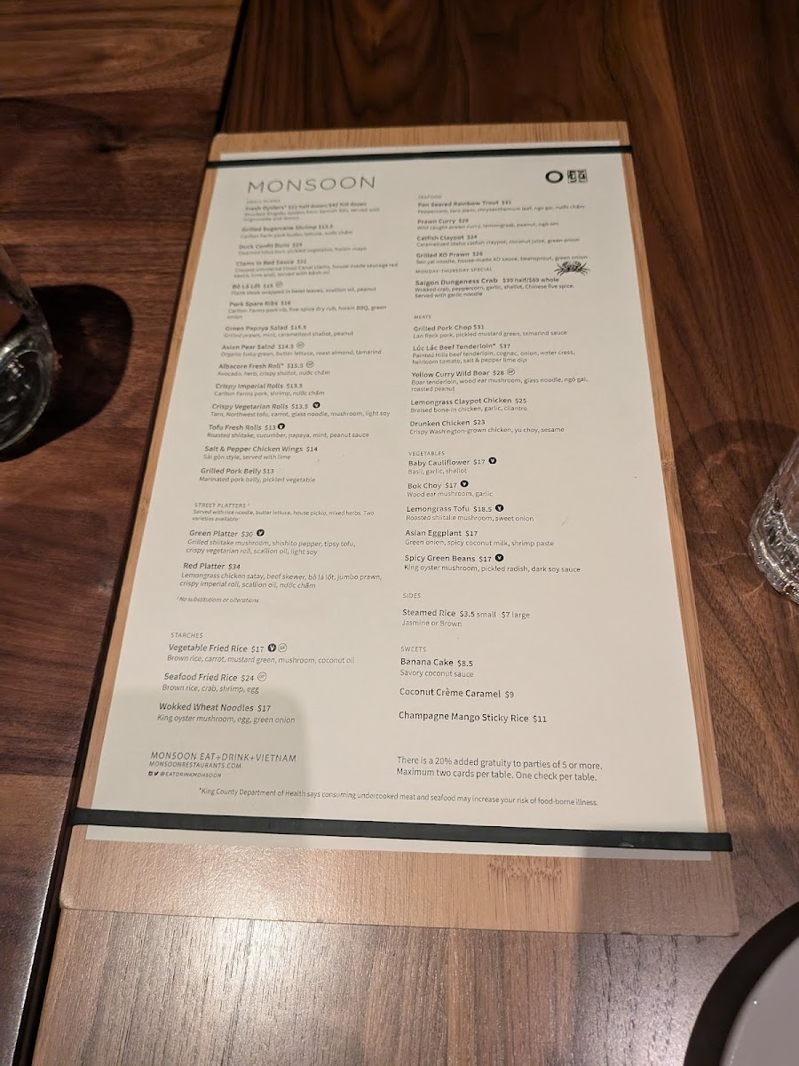 As you step inside Monsoon, you're enveloped in a warm and inviting atmosphere, where chic decor meets cozy seating, creating the perfect setting for both casual meals and special gatherings. The minimal yet attentive service ensures your dining experience is both pleasant and memorable.